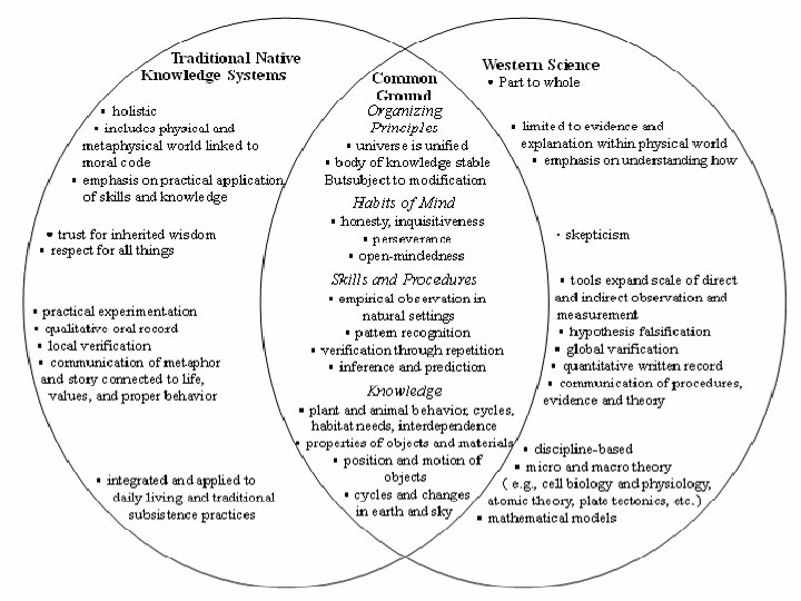 Two circles • Native knowledge – Make prominent part of schooling • Western science – Connect western knowledge to local knowledge • Common ground – Can be achieved with both systems • The foundation for integration