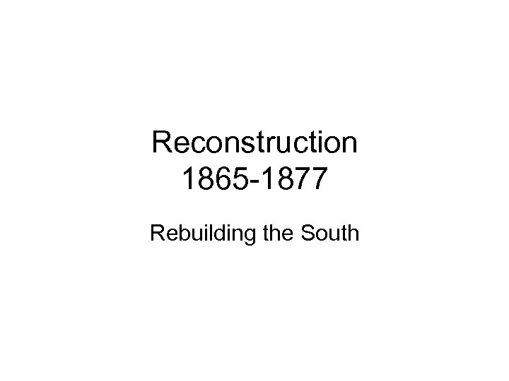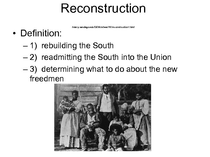 Reconstruction • Definition: history. sandiego. edu/GEN/civilwar/16/reconstruction 1. html – 1) rebuilding the South – 2) readmitting the South into the Union – 3) determining what to do about the new freedmen
