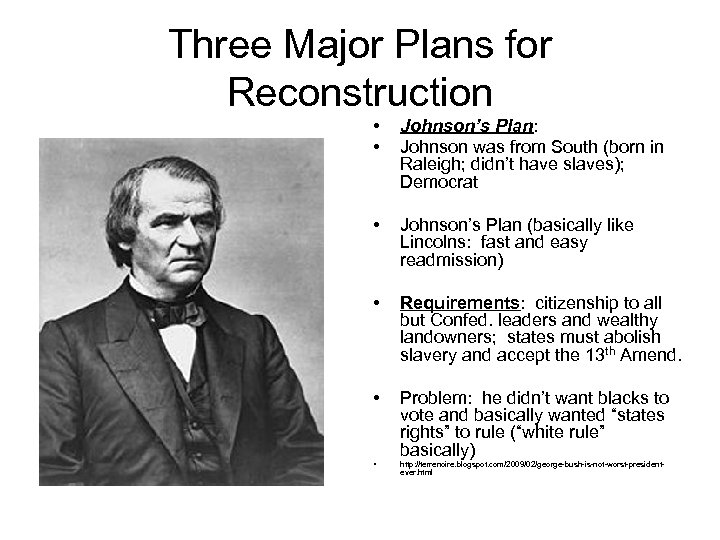 Three Major Plans for Reconstruction • • Johnson’s Plan: Johnson was from South (born in Raleigh; didn’t have slaves); Democrat • Johnson’s Plan (basically like Lincolns: fast and easy readmission) • Requirements: citizenship to all but Confed. leaders and wealthy landowners; states must abolish slavery and accept the 13 th Amend. • Problem: he didn’t want blacks to vote and basically wanted “states rights” to rule (“white rule” basically) • http: //terrenoire. blogspot. com/2009/02/george-bush-is-not-worst-presidentever. html