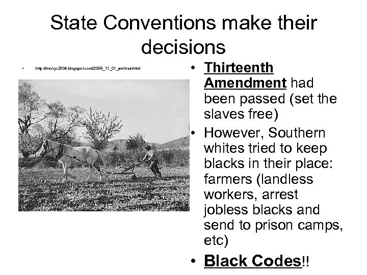 State Conventions make their decisions • http: //rncnyc 2004. blogspot. com/2008_11_01_archive. html • Thirteenth Amendment had been passed (set the slaves free) • However, Southern whites tried to keep blacks in their place: farmers (landless workers, arrest jobless blacks and send to prison camps, etc) • Black Codes!!