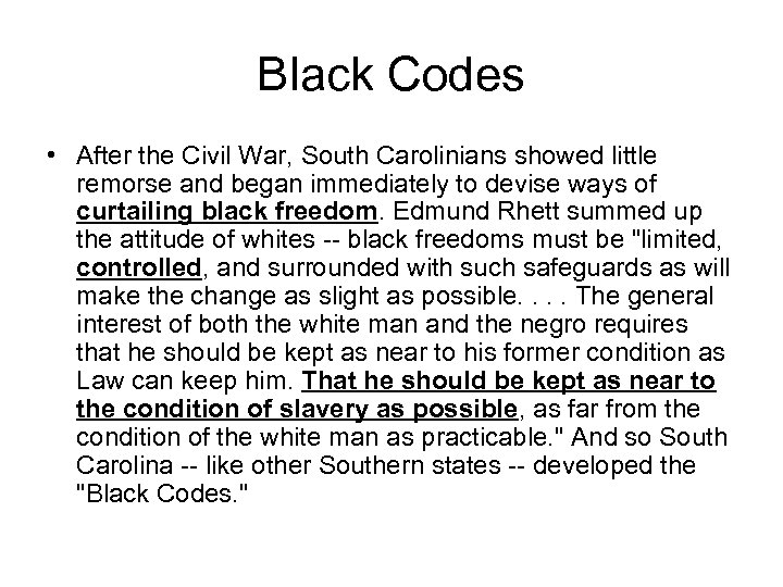 Black Codes • After the Civil War, South Carolinians showed little remorse and began immediately to devise ways of curtailing black freedom. Edmund Rhett summed up the attitude of whites -- black freedoms must be "limited, controlled, and surrounded with such safeguards as will make the change as slight as possible. . The general interest of both the white man and the negro requires that he should be kept as near to his former condition as Law can keep him. That he should be kept as near to the condition of slavery as possible, as far from the condition of the white man as practicable. " And so South Carolina -- like other Southern states -- developed the "Black Codes. "