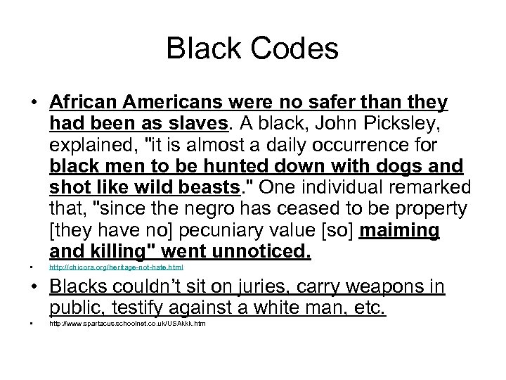 Black Codes • African Americans were no safer than they had been as slaves. A black, John Picksley, explained, "it is almost a daily occurrence for black men to be hunted down with dogs and shot like wild beasts. " One individual remarked that, "since the negro has ceased to be property [they have no] pecuniary value [so] maiming and killing" went unnoticed. • http: //chicora. org/heritage-not-hate. html • Blacks couldn’t sit on juries, carry weapons in public, testify against a white man, etc. • http: //www. spartacus. schoolnet. co. uk/USAkkk. htm