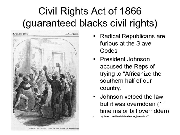 Civil Rights Act of 1866 (guaranteed blacks civil rights) • Radical Republicans are furious at the Slave Codes • President Johnson accused the Reps of trying to “Africanize the southern half of our country. ” • Johnson vetoed the law but it was overridden (1 st time major bill overridden) • http: //www. columbia. edu/itc/law/witt/raw_images/lect 17/