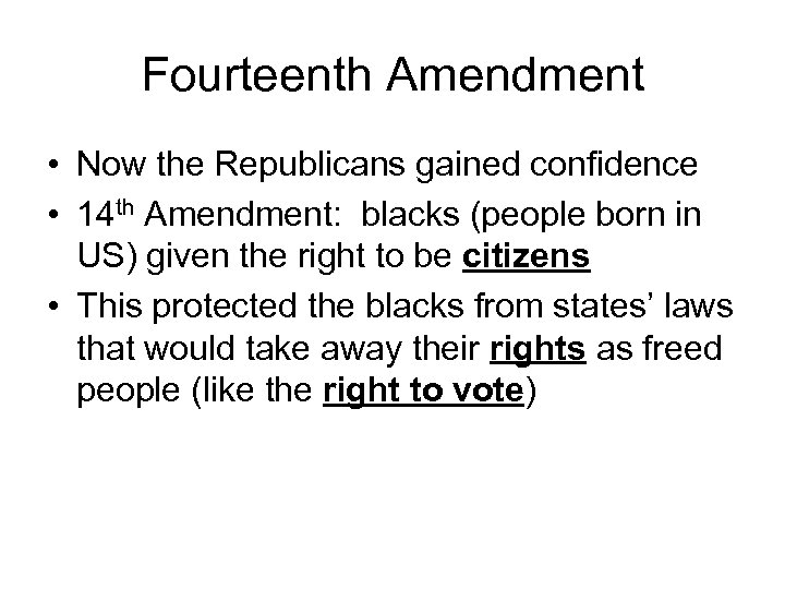 Fourteenth Amendment • Now the Republicans gained confidence • 14 th Amendment: blacks (people born in US) given the right to be citizens • This protected the blacks from states’ laws that would take away their rights as freed people (like the right to vote)