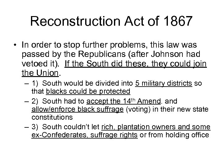 Reconstruction Act of 1867 • In order to stop further problems, this law was passed by the Republicans (after Johnson had vetoed it). If the South did these, they could join the Union. – 1) South would be divided into 5 military districts so that blacks could be protected – 2) South had to accept the 14 th Amend. and allow/enforce black suffrage (voting) in their new state constitutions – 3) South couldn’t let rich, plantation owners and some ex-Confederates, suffrage rights or from holding office