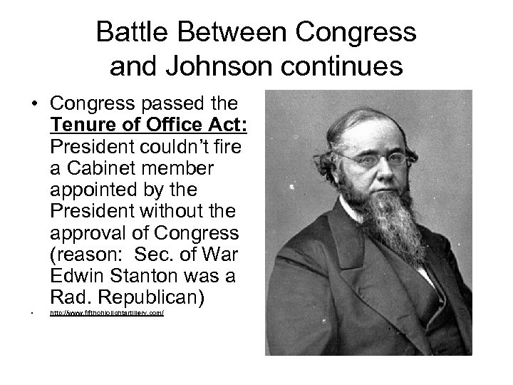 Battle Between Congress and Johnson continues • Congress passed the Tenure of Office Act: President couldn’t fire a Cabinet member appointed by the President without the approval of Congress (reason: Sec. of War Edwin Stanton was a Rad. Republican) • http: //www. fifthohiolightartillery. com/