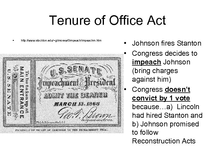 Tenure of Office Act • http: //www. stockton. edu/~gilmorew/0 impeach/impeachm. htm • Johnson fires Stanton • Congress decides to impeach Johnson (bring charges against him) • Congress doesn’t convict by 1 vote because…a) Lincoln had hired Stanton and b) Johnson promised to follow Reconstruction Acts