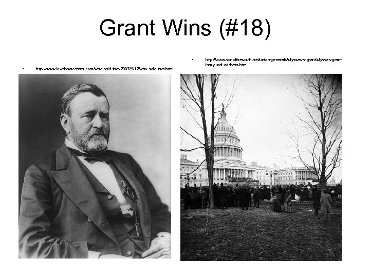 Grant Wins (#18) • • http: //www. lowdowncentral. com/who-said-that/2007/9/12/who-said-that. html http: //www. sonofthesouth. net/union-generals/ulysses-s-grant/ulysses-grantinaugural-address. htm