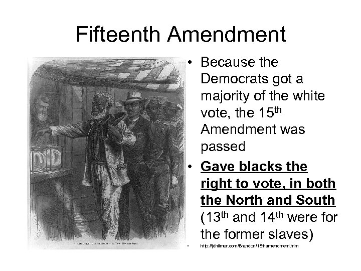 Fifteenth Amendment • Because the Democrats got a majority of the white vote, the 15 th Amendment was passed • Gave blacks the right to vote, in both the North and South (13 th and 14 th were for the former slaves) • http: //jdhilmer. com/Brandon/15 thamendment. htm