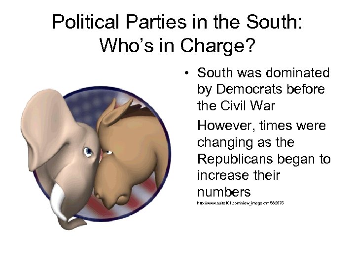 Political Parties in the South: Who’s in Charge? • South was dominated by Democrats before the Civil War • However, times were changing as the Republicans began to increase their numbers • http: //www. suite 101. com/view_image. cfm/682573