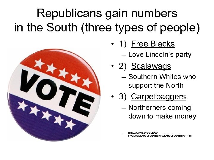 Republicans gain numbers in the South (three types of people) • 1) Free Blacks – Love Lincoln’s party • 2) Scalawags – Southern Whites who support the North • 3) Carpetbaggers – Northerners coming down to make money – http: //www. syp. org. uk/getinvolved/electoralregistration. htm