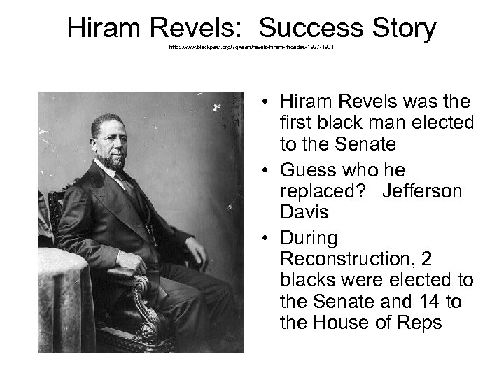 Hiram Revels: Success Story http: //www. blackpast. org/? q=aah/revels-hiram-rhoades-1827 -1901 • Hiram Revels was the first black man elected to the Senate • Guess who he replaced? Jefferson Davis • During Reconstruction, 2 blacks were elected to the Senate and 14 to the House of Reps