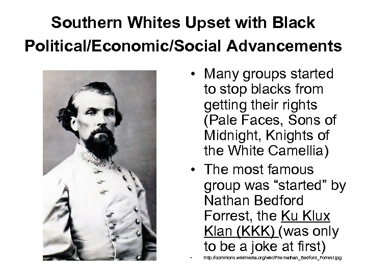 Southern Whites Upset with Black Political/Economic/Social Advancements • Many groups started to stop blacks from getting their rights (Pale Faces, Sons of Midnight, Knights of the White Camellia) • The most famous group was “started” by Nathan Bedford Forrest, the Ku Klux Klan (KKK) (was only to be a joke at first) • http: //commons. wikimedia. org/wiki/File: Nathan_Bedford_Forrest. jpg