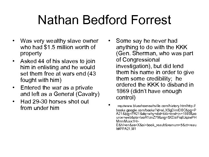 Nathan Bedford Forrest • Was very wealthy slave owner who had $1. 5 million worth of property • Asked 44 of his slaves to join him in enlisting and he would set them free at wars end (43 fought with him) • Entered the war as a private and left as a General (Cavalry) • Had 29 -30 horses shot out from under him • Some say he never had anything to do with the KKK (Gen. Sherman, who was part of Congressional investigation), but did lend them his name in order to give them some credibility; he ordered the KKK to disband in 1869 (didn’t have enough control) • http: //www. blueshoenashville. com/history. htmlhttp: // books. google. com/books? id=a. LXSg. Diml. D 0 C&pg=P A 21&lpg=PA 21&dq=why+did+kkk+end+in+1869&so urce=web&ots=lso. R 1 zn. Z 79&sig=5 XDzi. Fiq 8 Jqzw. PH Mmn. Muvx 1 Hr. E&hl=en&sa=X&oi=book_result&resnum=5&ct=resu lt#PPA 21, M 1