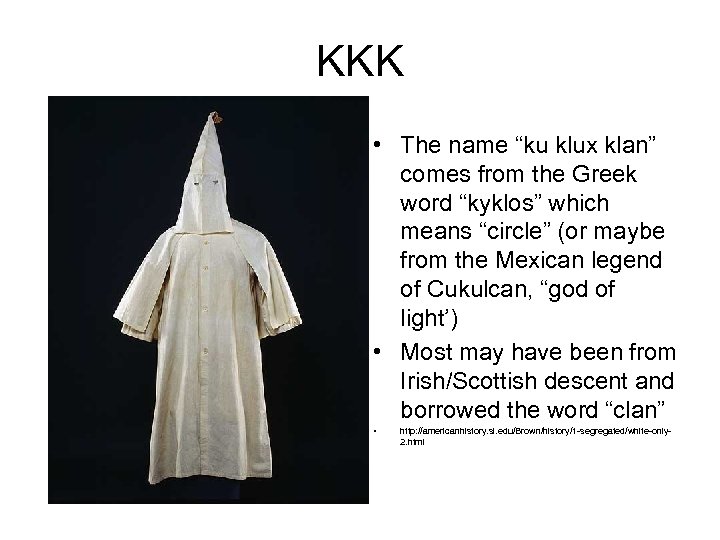 KKK • The name “ku klux klan” comes from the Greek word “kyklos” which means “circle” (or maybe from the Mexican legend of Cukulcan, “god of light’) • Most may have been from Irish/Scottish descent and borrowed the word “clan” • http: //americanhistory. si. edu/Brown/history/1 -segregated/white-only 2. html