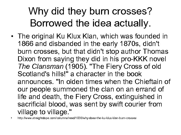 Why did they burn crosses? Borrowed the idea actually. • The original Ku Klux Klan, which was founded in 1866 and disbanded in the early 1870 s, didn't burn crosses, but that didn't stop author Thomas Dixon from saying they did in his pro-KKK novel The Clansman (1905). "The Fiery Cross of old Scotland's hills!" a character in the book announces. "In olden times when the Chieftain of our people summoned the clan on an errand of life and death, the Fiery Cross, extinguished in sacrificial blood, was sent by swift courier from village to village. " • http: //www. straightdope. com/columns/read/1038/why-does-the-ku-klux-klan-burn-crosses