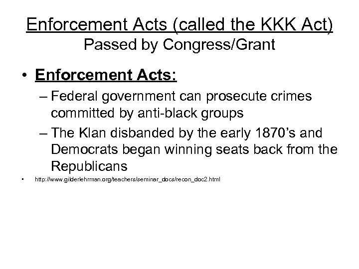 Enforcement Acts (called the KKK Act) Passed by Congress/Grant • Enforcement Acts: – Federal government can prosecute crimes committed by anti-black groups – The Klan disbanded by the early 1870’s and Democrats began winning seats back from the Republicans • http: //www. gilderlehrman. org/teachers/seminar_docs/recon_doc 2. html