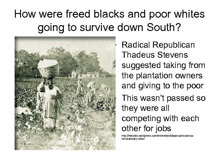 How were freed blacks and poor whites going to survive down South? • Radical Republican Thadeus Stevens suggested taking from the plantation owners and giving to the poor • This wasn’t passed so they were all competing with each other for jobs • http: //mikeely. wordpress. com/interviews/blacks-and-jews-arevolutionary-view/