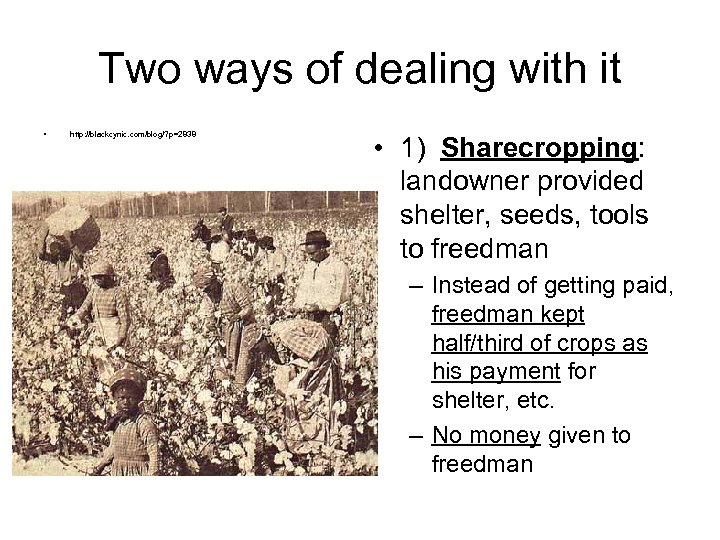Two ways of dealing with it • http: //blackcynic. com/blog/? p=2838 • 1) Sharecropping: landowner provided shelter, seeds, tools to freedman – Instead of getting paid, freedman kept half/third of crops as his payment for shelter, etc. – No money given to freedman
