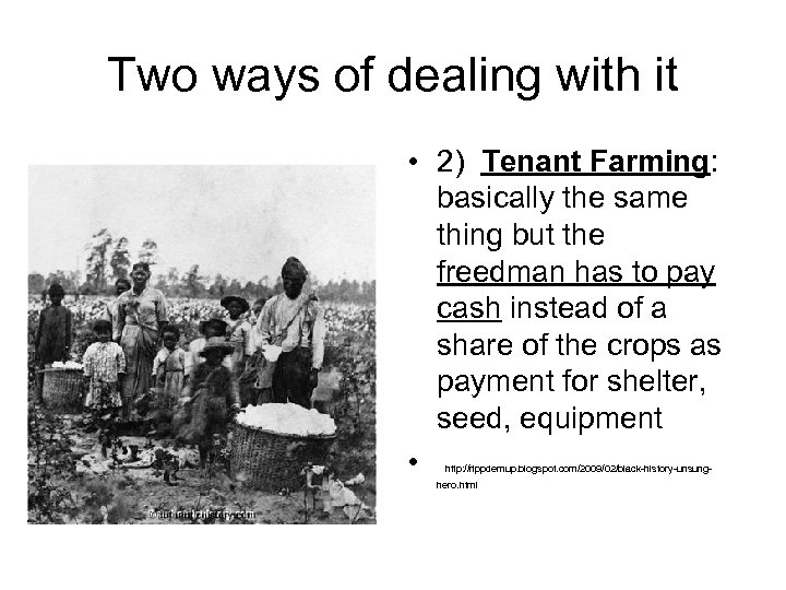 Two ways of dealing with it • 2) Tenant Farming: basically the same thing but the freedman has to pay cash instead of a share of the crops as payment for shelter, seed, equipment • http: //rippdemup. blogspot. com/2009/02/black-history-unsung- hero. html