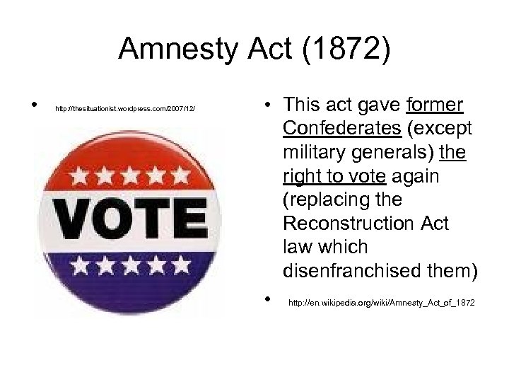 Amnesty Act (1872) • http: //thesituationist. wordpress. com/2007/12/ • This act gave former Confederates (except military generals) the right to vote again (replacing the Reconstruction Act law which disenfranchised them) • http: //en. wikipedia. org/wiki/Amnesty_Act_of_1872