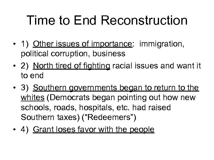 Time to End Reconstruction • 1) Other issues of importance: immigration, political corruption, business • 2) North tired of fighting racial issues and want it to end • 3) Southern governments began to return to the whites (Democrats began pointing out how new schools, roads, hospitals, etc. had raised Southern taxes) (“Redeemers”) • 4) Grant loses favor with the people