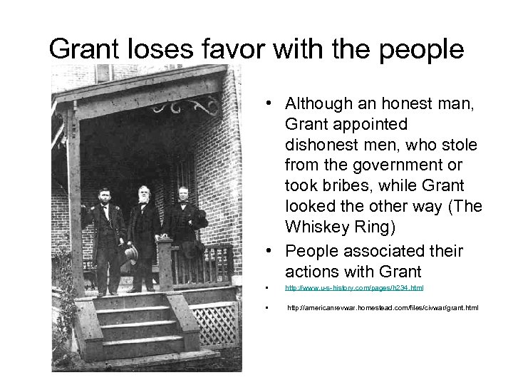 Grant loses favor with the people • Although an honest man, Grant appointed dishonest men, who stole from the government or took bribes, while Grant looked the other way (The Whiskey Ring) • People associated their actions with Grant • http: //www. u-s-history. com/pages/h 234. html • http: //americanrevwar. homestead. com/files/civwar/grant. html