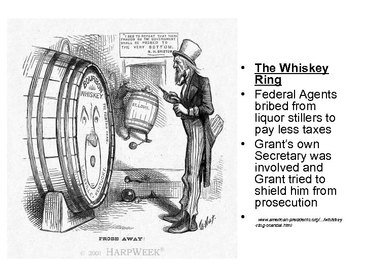 • The Whiskey Ring • Federal Agents bribed from liquor stillers to pay less taxes • Grant’s own Secretary was involved and Grant tried to shield him from prosecution • www. american-presidents. org/. . . /whiskey -ring-scandal. html