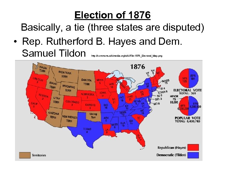 Election of 1876 Basically, a tie (three states are disputed) • Rep. Rutherford B. Hayes and Dem. Samuel Tildon http: //commons. wikimedia. org/wiki/File: 1876_Electoral_Map. png
