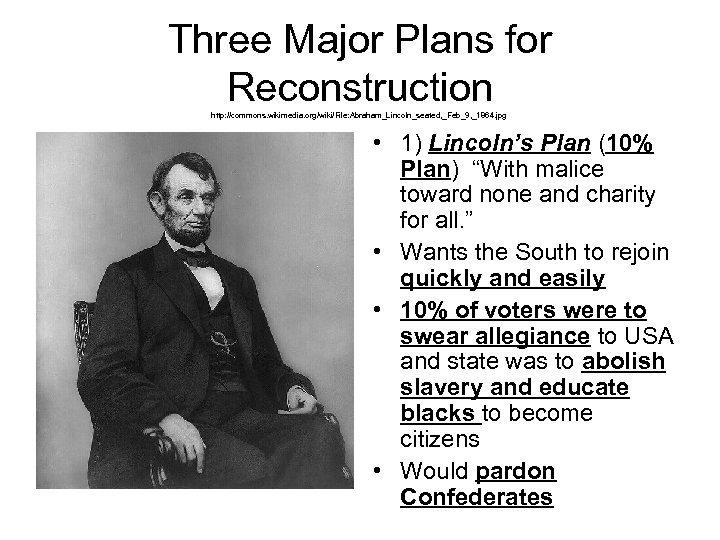 Three Major Plans for Reconstruction http: //commons. wikimedia. org/wiki/File: Abraham_Lincoln_seated, _Feb_9, _1864. jpg • 1) Lincoln’s Plan (10% Plan) “With malice toward none and charity for all. ” • Wants the South to rejoin quickly and easily • 10% of voters were to swear allegiance to USA and state was to abolish slavery and educate blacks to become citizens • Would pardon Confederates