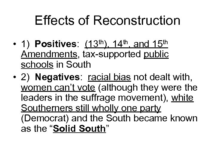 Effects of Reconstruction • 1) Positives: (13 th), 14 th, and 15 th Amendments, tax-supported public schools in South • 2) Negatives: racial bias not dealt with, women can’t vote (although they were the leaders in the suffrage movement), white Southerners still wholly one party (Democrat) and the South became known as the “Solid South”