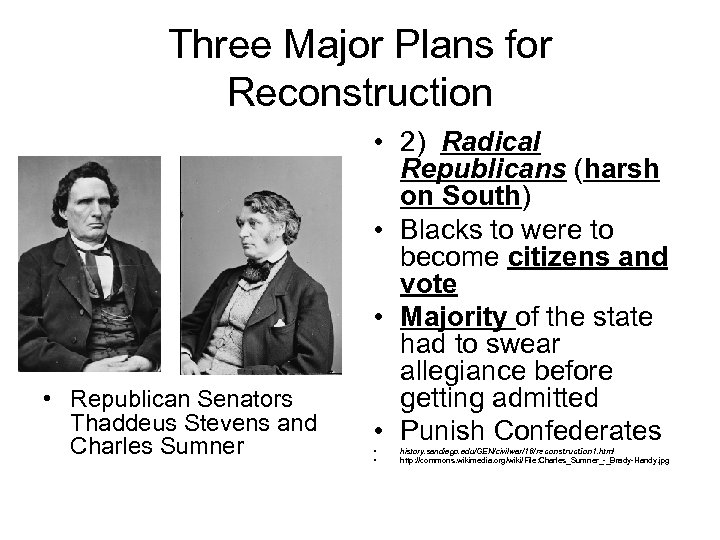 Three Major Plans for Reconstruction • Republican Senators Thaddeus Stevens and Charles Sumner • 2) Radical Republicans (harsh on South) • Blacks to were to become citizens and vote • Majority of the state had to swear allegiance before getting admitted • Punish Confederates • • history. sandiego. edu/GEN/civilwar/16/reconstruction 1. html http: //commons. wikimedia. org/wiki/File: Charles_Sumner_-_Brady-Handy. jpg