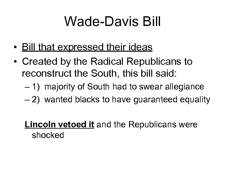 Wade-Davis Bill • Bill that expressed their ideas • Created by the Radical Republicans to reconstruct the South, this bill said: – 1) majority of South had to swear allegiance – 2) wanted blacks to have guaranteed equality Lincoln vetoed it and the Republicans were shocked