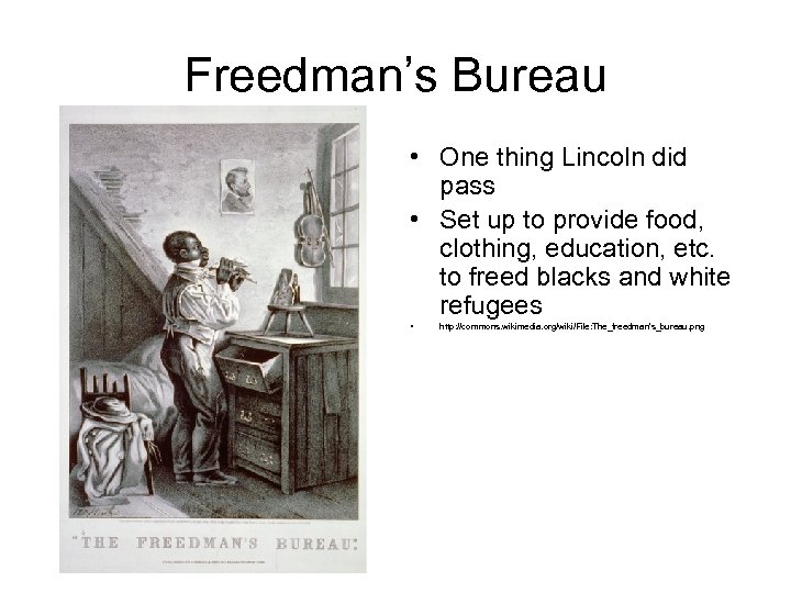 Freedman’s Bureau • One thing Lincoln did pass • Set up to provide food, clothing, education, etc. to freed blacks and white refugees • http: //commons. wikimedia. org/wiki/File: The_freedman's_bureau. png