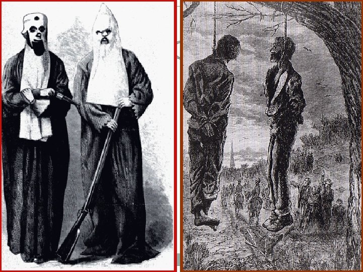 Ku Klux Klan In 1866 a group of white southerners created the Ku Klux Klan. The KKK was a secret society opposed to African Americans obtaining civil rights, particularly the right to vote. The KKK used violence and intimidation to frighten blacks. Klan members wore white robes and hoods to hide their identities. The Klan was known to have murdered many people.