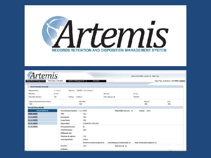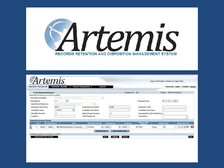 Records Disposal: ARTEMIS Records Retention and Disposition Management System (ARTEMIS) Search and view retention schedules for County and Municipal agencies only. Create, View, Update, and Submit Disposition Requests. Update Disposition Status for their agency Municipalities: Contact your Municipal Clerk Counties: Contact County Clerk