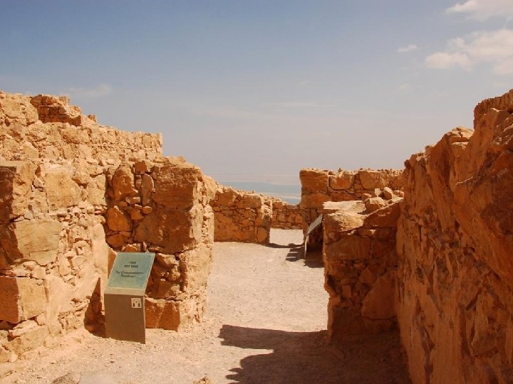 Entre las ruinas se encontró la última lectura Bíblica leida en este lugar: Fue el rollo de Ezequiel. Se sabe porque fue el único rollo que estaba abierto. Ruinas de la sinagoga que estaba en lo alto de Masada. Data del período del segundo templo