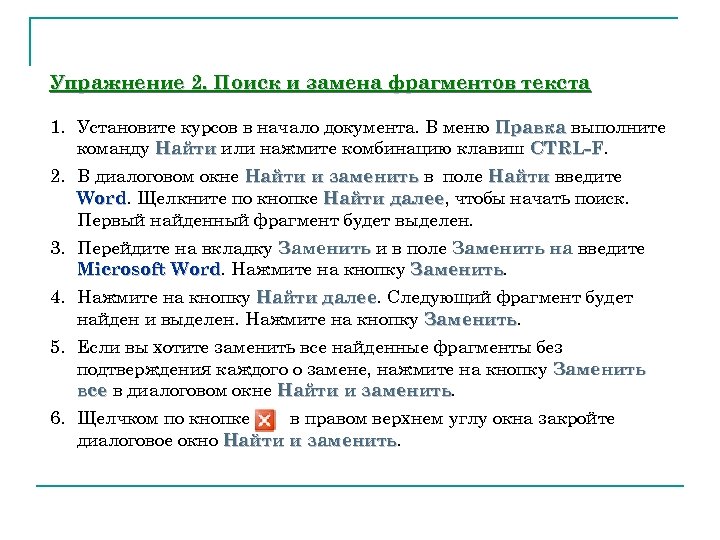 Упражнение 2. Поиск и замена фрагментов текста 1. Установите курсов в начало документа. В меню Правка выполните команду Найти или нажмите комбинацию клавиш CTRL-F. 2. В диалоговом окне Найти и заменить в поле Найти введите Word. Щелкните по кнопке Найти далее, чтобы начать поиск. Word далее Первый найденный фрагмент будет выделен. 3. Перейдите на вкладку Заменить и в поле Заменить на введите Microsoft Word. Нажмите на кнопку Заменить. Word Заменить 4. Нажмите на кнопку Найти далее. Следующий фрагмент будет далее найден и выделен. Нажмите на кнопку Заменить 5. Если вы хотите заменить все найденные фрагменты без подтверждения каждого о замене, нажмите на кнопку Заменить все в диалоговом окне Найти и заменить 6. Щелчком по кнопке в правом верхнем углу окна закройте диалоговое окно Найти и заменить