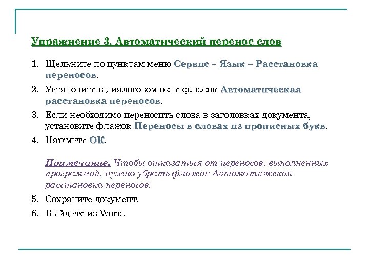 Упражнение 3. Автоматический перенос слов 1. Щелкните по пунктам меню Сервис – Язык – Расстановка переносов 2. Установите в диалоговом окне флажок Автоматическая расстановка переносов 3. Если необходимо переносить слова в заголовках документа, установите флажок Переносы в словах из прописных букв 4. Нажмите ОК. ОК Примечание. Чтобы отказаться от переносов, выполненных программой, нужно убрать флажок Автоматическая расстановка переносов. 5. Сохраните документ. 6. Выйдите из Word.