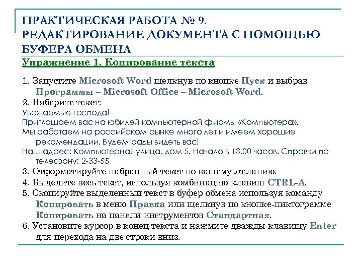 ПРАКТИЧЕСКАЯ РАБОТА № 9. РЕДАКТИРОВАНИЕ ДОКУМЕНТА С ПОМОЩЬЮ БУФЕРА ОБМЕНА Упражнение 1. Копирование текста 1. Запустите Microsoft Word щелкнув по кнопке Пуск и выбрав Программы – Microsoft Office – Microsoft Word 2. Наберите текст: Уважаемые господа! Приглашаем вас на юбилей компьютерной фирмы «Компьютера» . Мы работаем на российском рынке много лет и имеем хорошие рекомендации. Будем рады видеть вас! Наш адрес: Компьютерная улица, дом 5. Начало в 18. 00 часов. Справки по телефону: 2 -33 -55 3. Отформатируйте набранный текст по вашему желанию. 4. Выделите весь текст, используя комбинацию клавиш CTRL-A. 5. Скопируйте выделенный текст в буфер обмена используя команду Копировать в меню Правка или щелкнув по кнопке-пиктограмме Копировать на панели инструментов Стандартная 6. Установите курсор в конец текста и нажмите дважды клавишу Enter для перехода на две строки вниз.