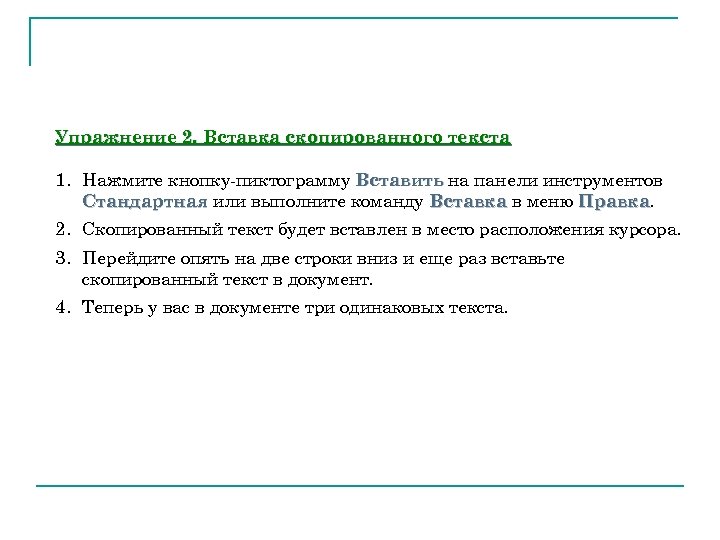 Упражнение 2. Вставка скопированного текста 1. Нажмите кнопку-пиктограмму Вставить на панели инструментов Стандартная или выполните команду Вставка в меню Правка 2. Скопированный текст будет вставлен в место расположения курсора. 3. Перейдите опять на две строки вниз и еще раз вставьте скопированный текст в документ. 4. Теперь у вас в документе три одинаковых текста.