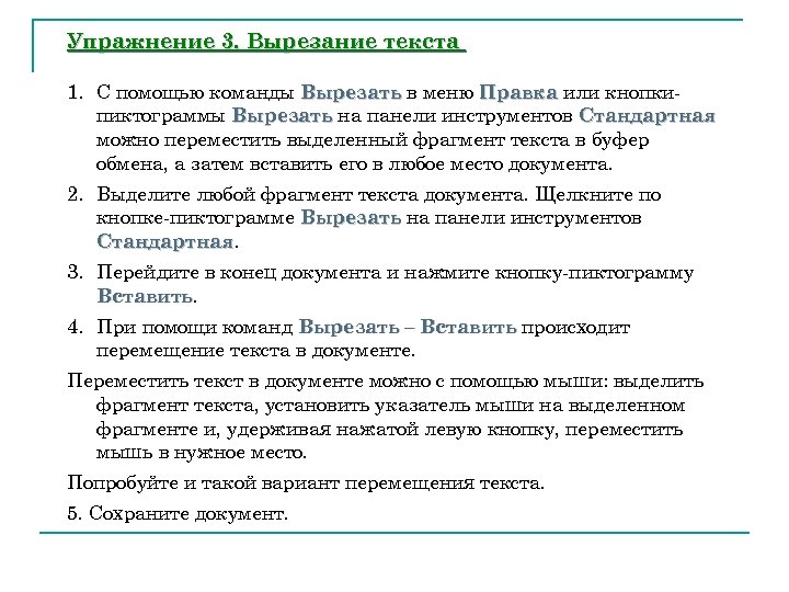 Упражнение 3. Вырезание текста 1. С помощью команды Вырезать в меню Правка или кнопкипиктограммы Вырезать на панели инструментов Стандартная можно переместить выделенный фрагмент текста в буфер обмена, а затем вставить его в любое место документа. 2. Выделите любой фрагмент текста документа. Щелкните по кнопке-пиктограмме Вырезать на панели инструментов Стандартная 3. Перейдите в конец документа и нажмите кнопку-пиктограмму Вставить 4. При помощи команд Вырезать – Вставить происходит перемещение текста в документе. Переместить текст в документе можно с помощью мыши: выделить фрагмент текста, установить указатель мыши на выделенном фрагменте и, удерживая нажатой левую кнопку, переместить мышь в нужное место. Попробуйте и такой вариант перемещения текста. 5. Сохраните документ.