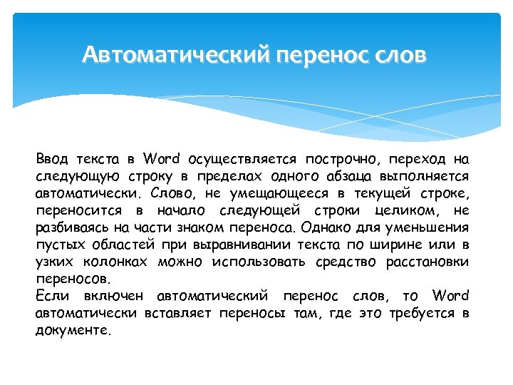 Автоматический перенос слов Ввод текста в Word осуществляется построчно, переход на следующую строку в пределах одного абзаца выполняется автоматически. Слово, не умещающееся в текущей строке, переносится в начало следующей строки целиком, не разбиваясь на части знаком переноса. Однако для уменьшения пустых областей при выравнивании текста по ширине или в узких колонках можно использовать средство расстановки переносов. Если включен автоматический перенос слов, то Word автоматически вставляет переносы там, где это требуется в документе.
