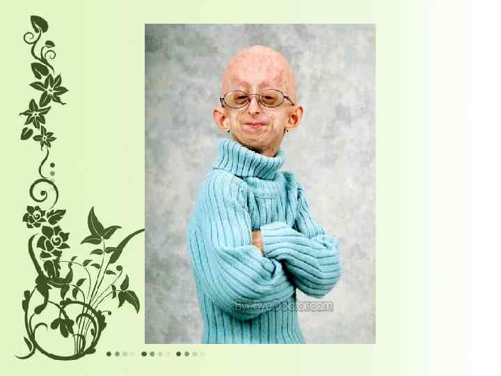 Прогерия (Синдром Хатчинсона. Гилфорда) Прогерия- один из редчайших генетических дефектов. При прогерии возникают изменения кожи и внутренних органов, которые обусловлены преждевременным старением организма.
