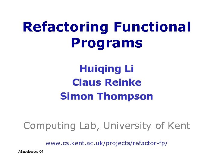 Refactoring Functional Programs Huiqing Li Claus Reinke Simon Thompson Computing Lab, University of Kent www. cs. kent. ac. uk/projects/refactor-fp/ Manchester 04