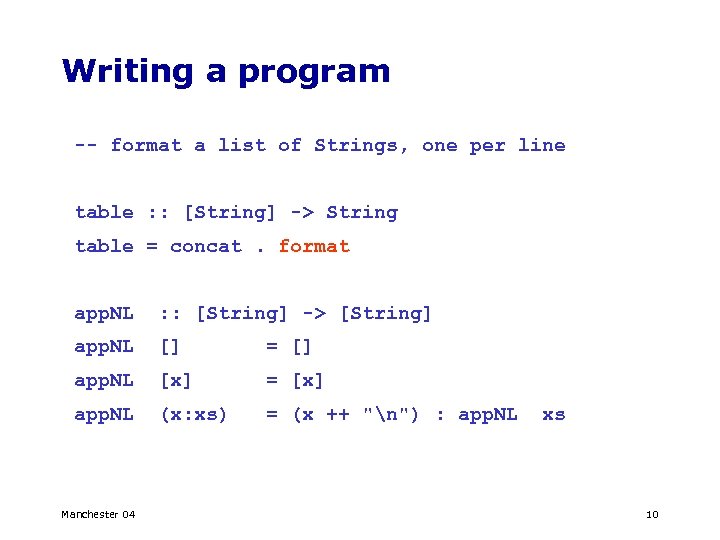 Writing a program -- format a list of Strings, one per line table : : [String] -> String table = concat. format app. NL : : [String] -> [String] app. NL [] = [] app. NL [x] = [x] app. NL (x: xs) = (x ++ "n") : app. NL Manchester 04 xs 9