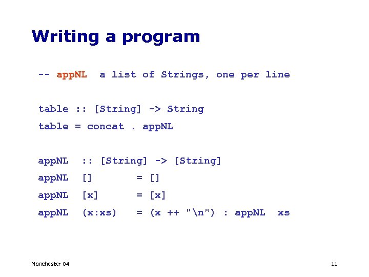 Writing a program -- app. NL a list of Strings, one per line table : : [String] -> String table = concat. app. NL : : [String] -> [String] app. NL [] = [] app. NL [x] = [x] app. NL (x: xs) = (x ++ "n") : app. NL Manchester 04 xs 11