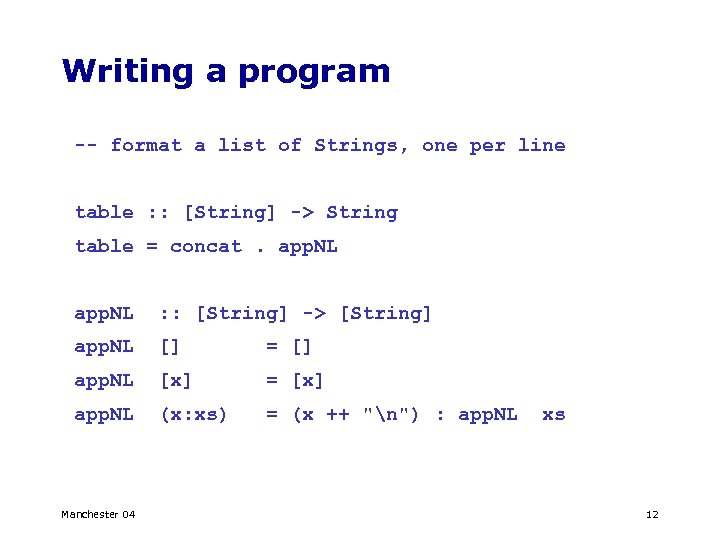 Writing a program -- format a list of Strings, one per line table : : [String] -> String table = concat. app. NL : : [String] -> [String] app. NL [] = [] app. NL [x] = [x] app. NL (x: xs) = (x ++ "n") : app. NL Manchester 04 xs 12