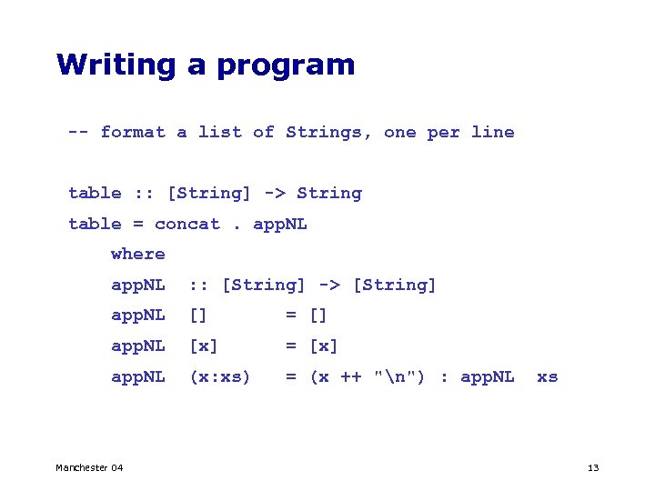 Writing a program -- format a list of Strings, one per line table : : [String] -> String table = concat. app. NL where app. NL : : [String] -> [String] app. NL [] = [] app. NL [x] = [x] app. NL (x: xs) = (x ++ "n") : app. NL Manchester 04 xs 13