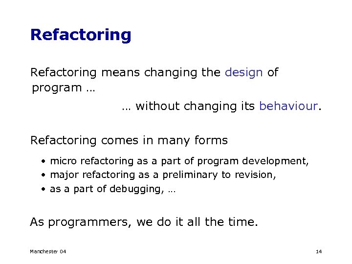 Refactoring means changing the design of program … … without changing its behaviour. Refactoring comes in many forms • micro refactoring as a part of program development, • major refactoring as a preliminary to revision, • as a part of debugging, … As programmers, we do it all the time. Manchester 04 14